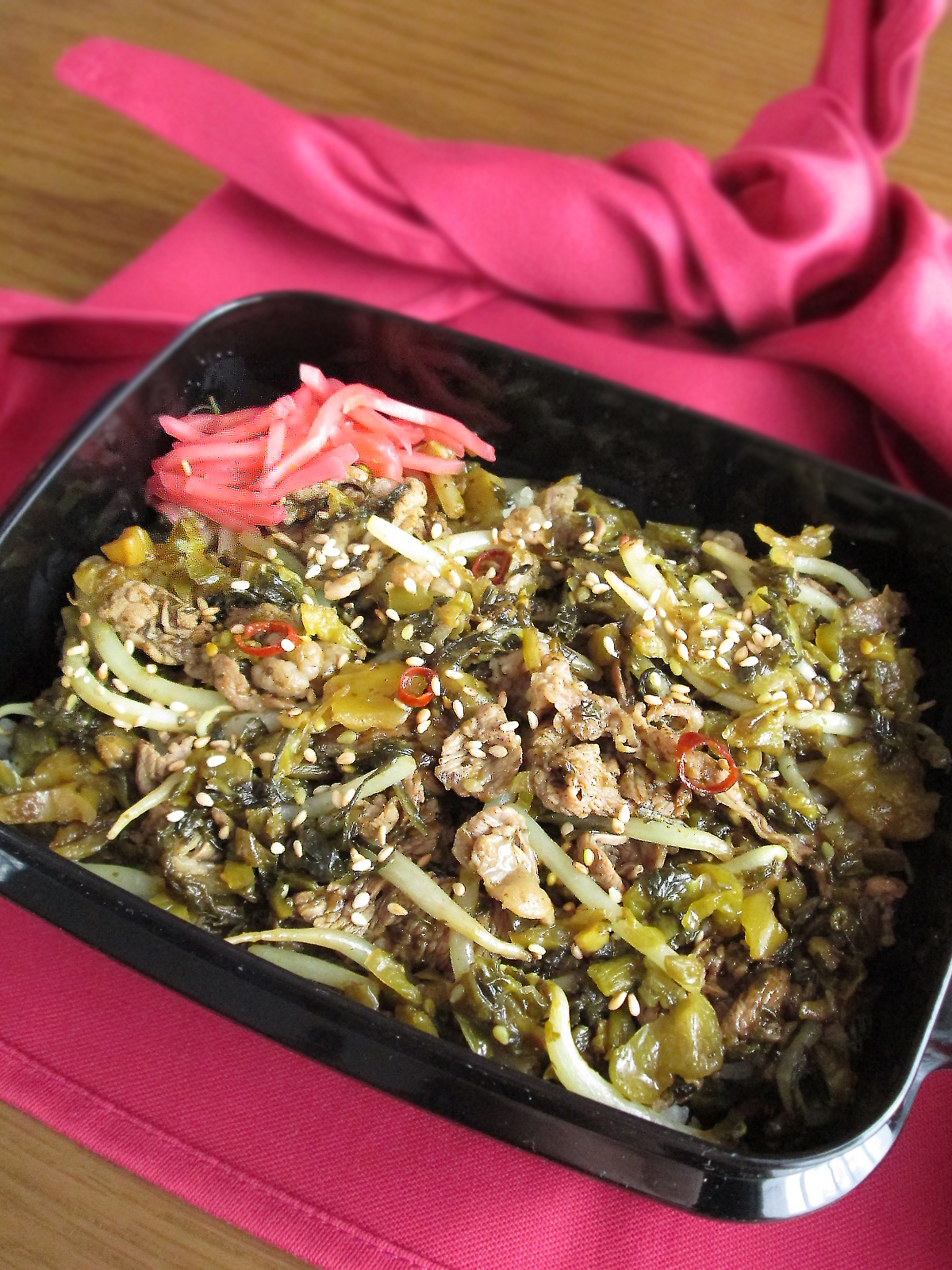 包丁もまな板も使わず、朝でも手軽で簡単に作れるスタミナ丼!高菜しょうゆ漬け、のり佃煮を使うことで最小限の味付けで仕上がります。お好みでラー油をかけてもおいしい…